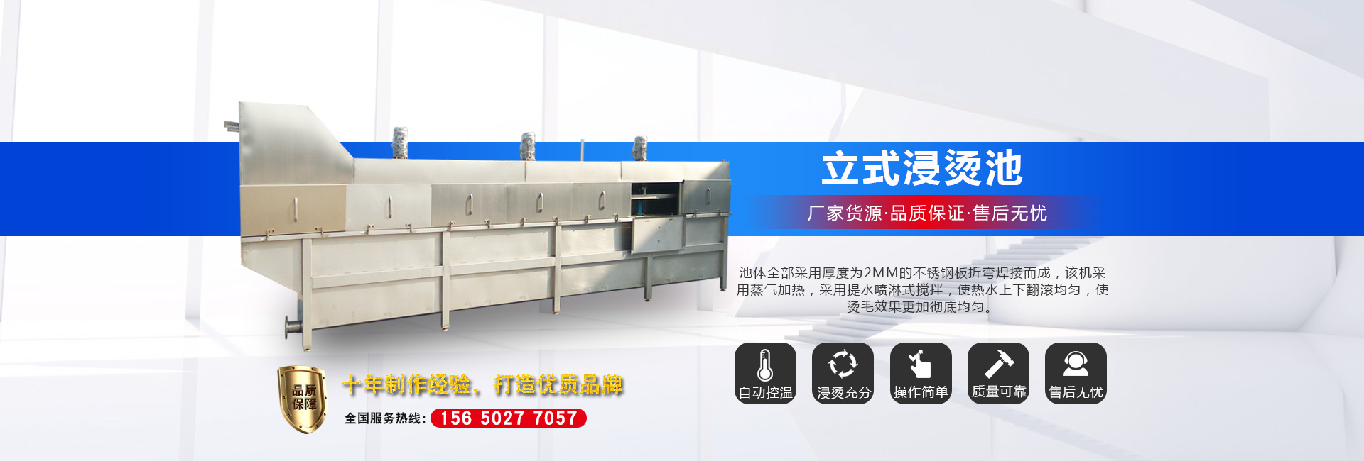 公司主要設備有:A字型立式脫毛機、臥式脫毛機、強力噴淋機、松毛機、浸燙池、螺旋預冷機、禽籠清洗機、電暈機、兔割前爪/后爪機、剝胗機、自動洗鉤機、螺旋燙爪機、雞爪脫皮機、分割輸送帶等屠宰用設備。 |